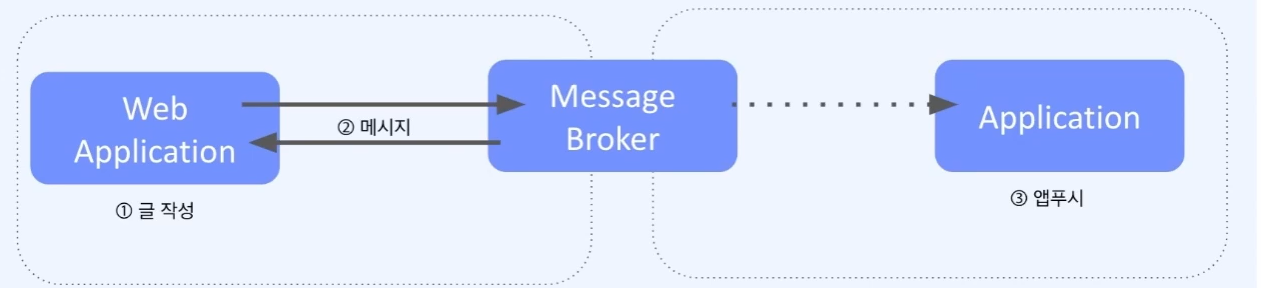 위 그림은 소셜서비스 가상 시나리오이다. 어떤 유저 A가 글을 적었고, A를 팔로우하고있는 유저에게 앱푸시를 한다고 가정해보자. Sync(동기)로 위 과정을 진행한다면, 팔로우하는 모든 사람들에게 앱푸시를 보내고, 클라이언트한테 글작성 응답을 주는 것은 너무 느리다. 그래서 메세지 브로커에게 할 작업을 던져주고, 글작성은 바로 응답을 받고, 메세지 브로커와 앱 사이에서는 비동기적으로 앱푸시를 진행하게된다.