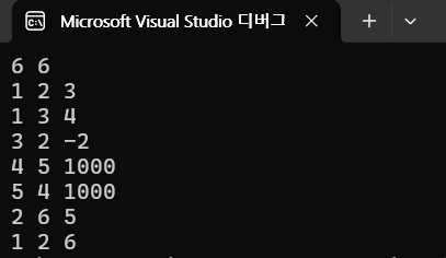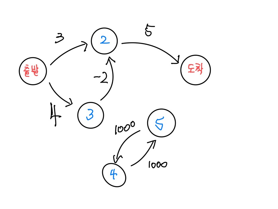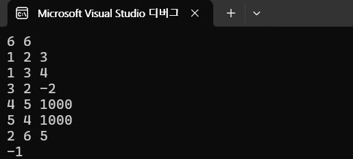 무슨 말이냐면 (출발) ~ (도착) 사이 경로에 아무 상관이 없는 노드들인데 결과에 영향을 준다는 점이다. 이 점에서 기존 코드에서 무조건적으로 양의사이클이 발생하면 -1을 출력하게 하는것이 아니라, 양의 사이클이 발생하더라도 출발노드와 도착노드와 연결이 되어있지 않으면 사이클이 없다고 판별하게끔 수정했다.