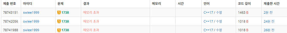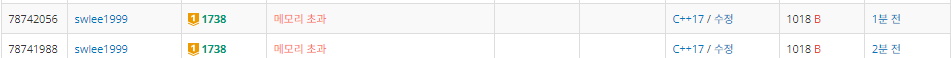 결론은 0, -1 사용할때만 memset을 사용하는 것이고, 또한 복사를 통한 메모리 낭비가 있기 때문에 사이즈가 엄청큰 배열이 아니고서야 for문 쓰든가, fill함수 사용하는 것이 좋다라는 내용이고 실제로도 내 코드에서 memset부분을 fill로 바꿔주니 바로 초록불이 떴다,,!!