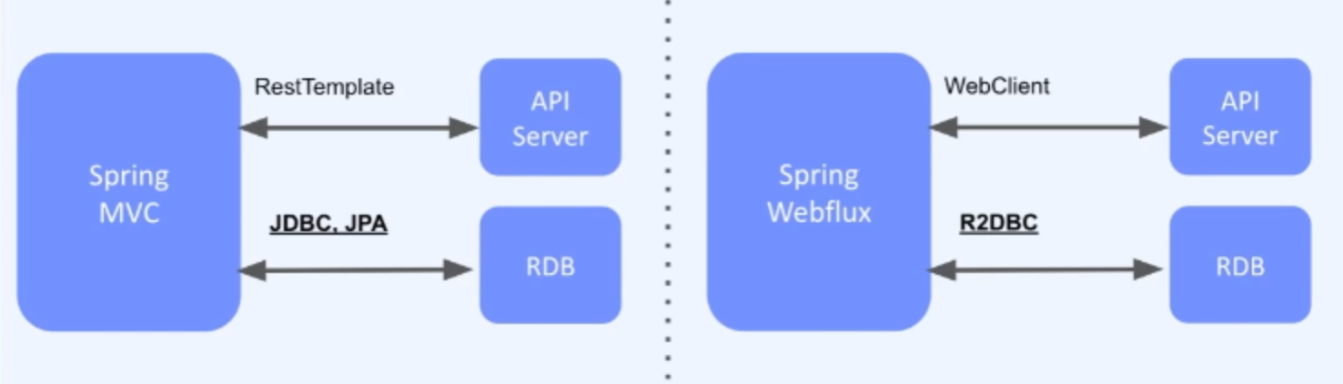 - 전체 흐름도에서 모든것이 비동기로 처리가 되어야 Webflux를 제대로 활용할수 있다는 뜻이다.