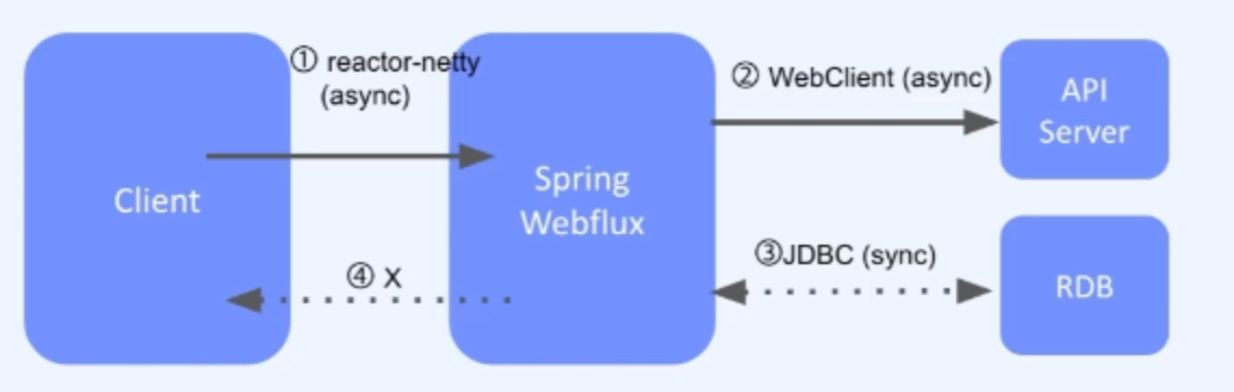 먼저 우리가 아는 Spring Webflux는 비동기 기반이다. 그런데 위 그림과 같은 상황을 생각해보자.