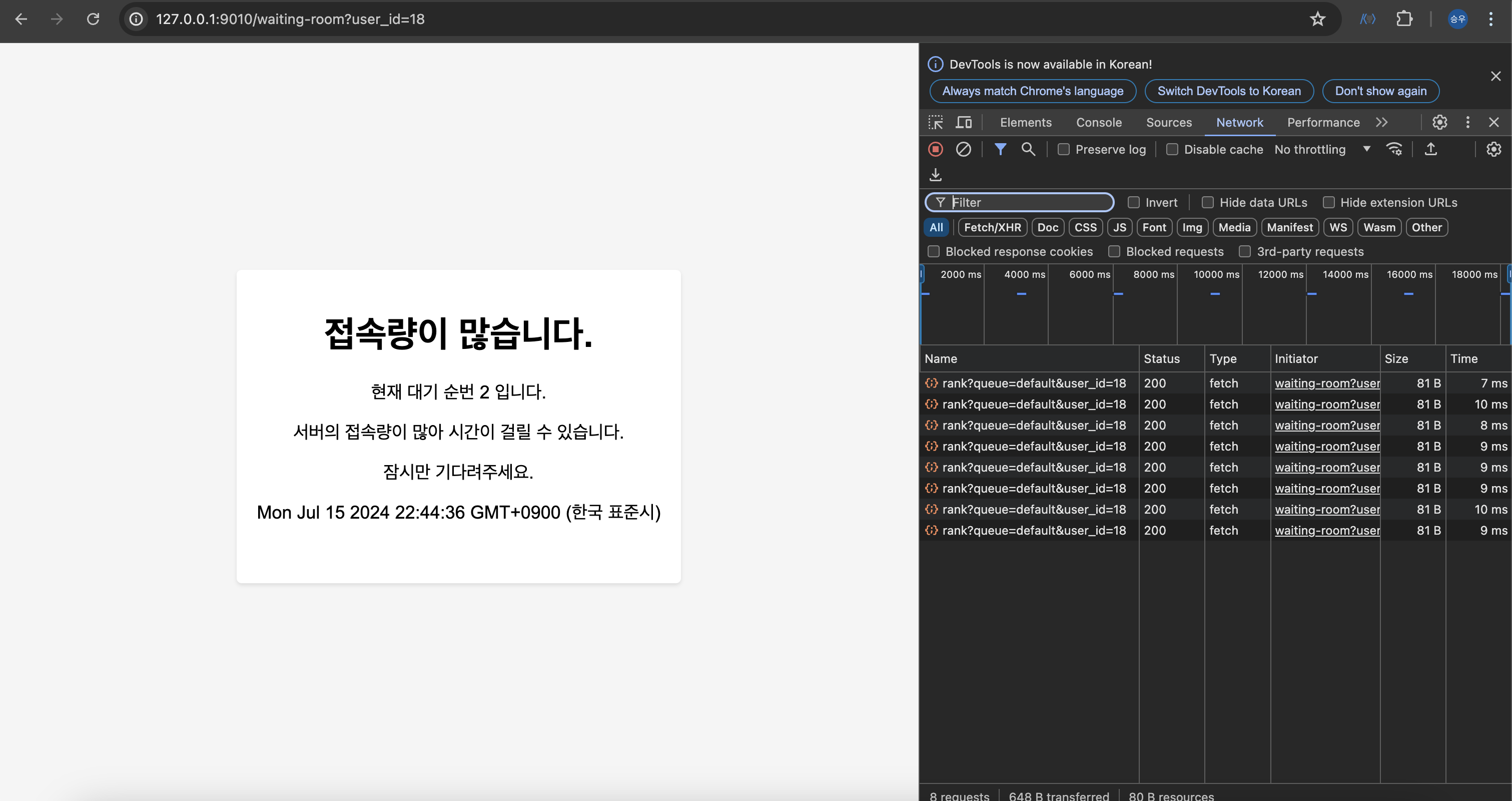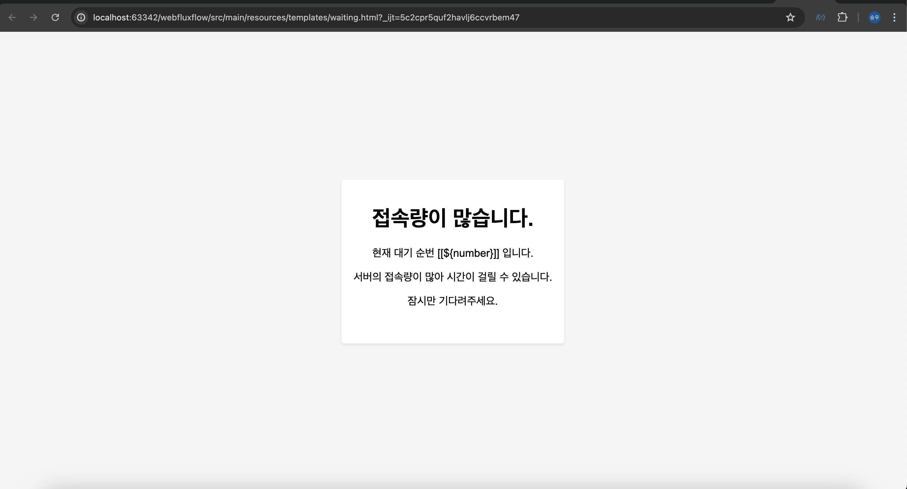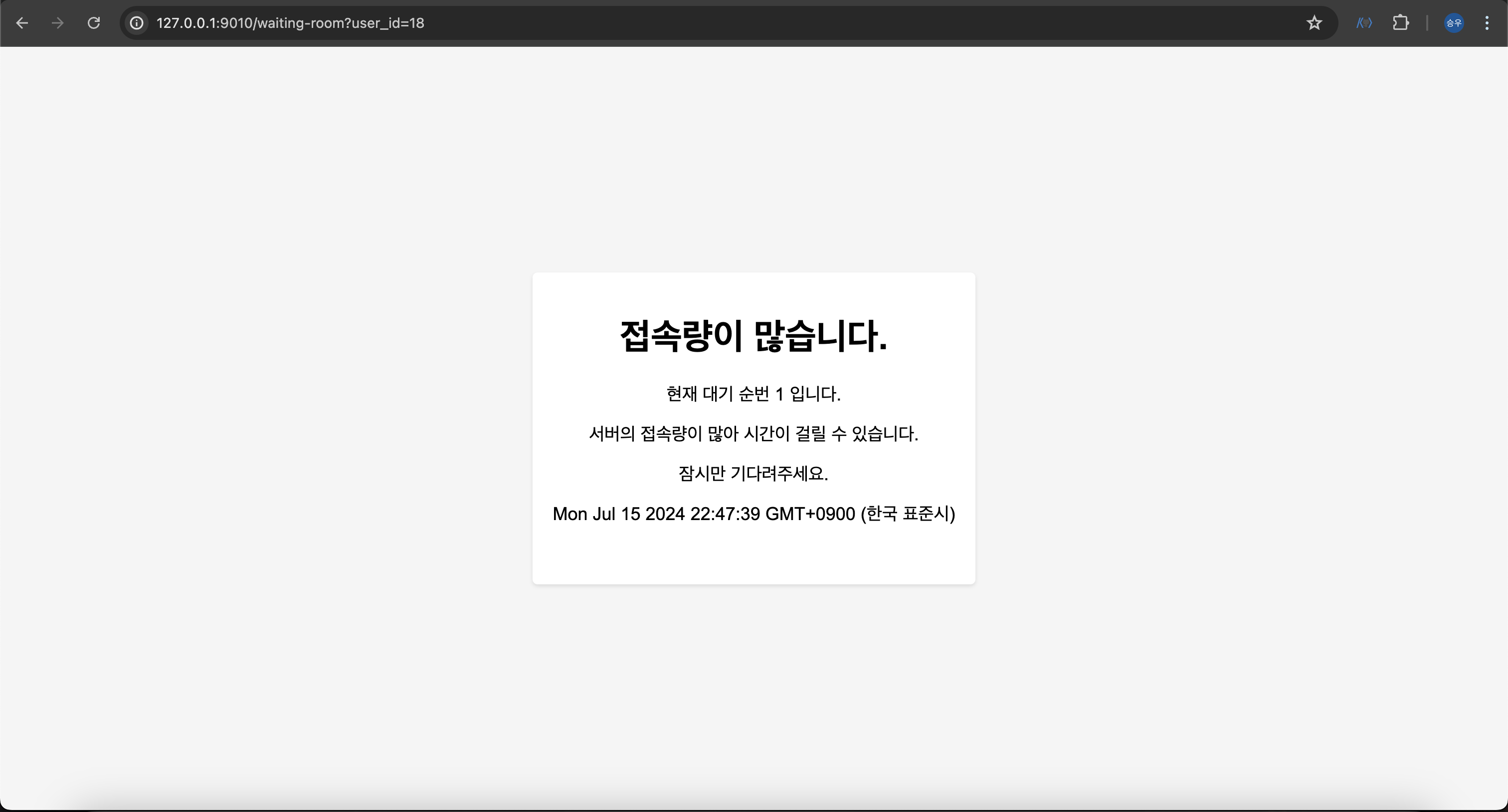 아직 waiting queue에 있는 사용자이므로 다음과 같이 화면이 렌더링된다. proceed queue에 진입이 허가되지 않은 사용자는 자동으로 waiting queue에 추가되고 위와 같은 화면이 렌더링 된다.