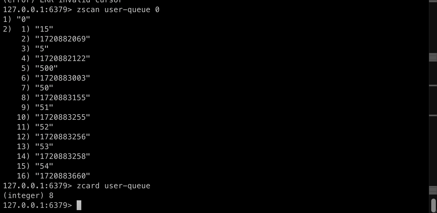- Redis(Queue : Sorted Set으로 접속자 관리) Key : 사용자ID, Value : 요청시간 -> 선착순 입장 보장