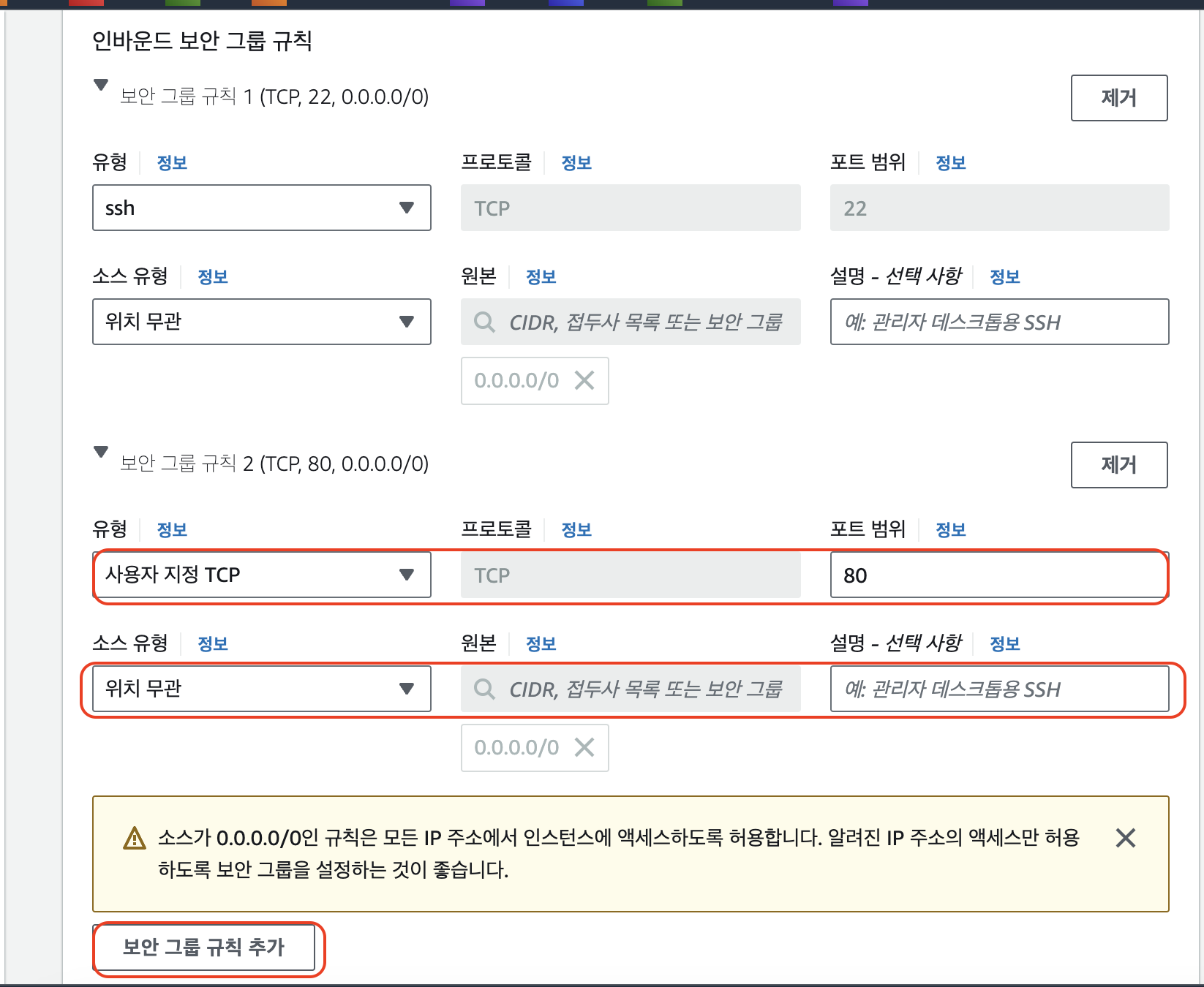 > ssh 22번 포트는 자동으로 추가되어 있음(default)