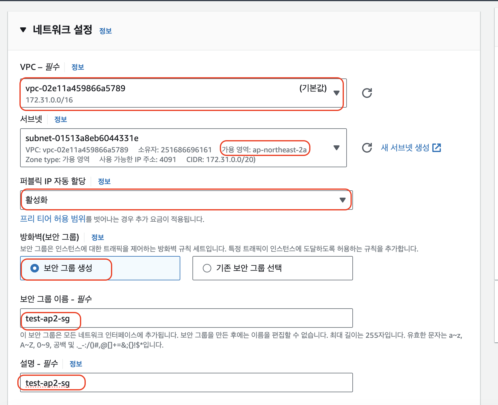 네트워크 : Default VPC 내 ap-northeast-2a, 방화벽(보안그룹 : test-ap2-ag, 인바운드 22/TCP, 80/TCP 열기)