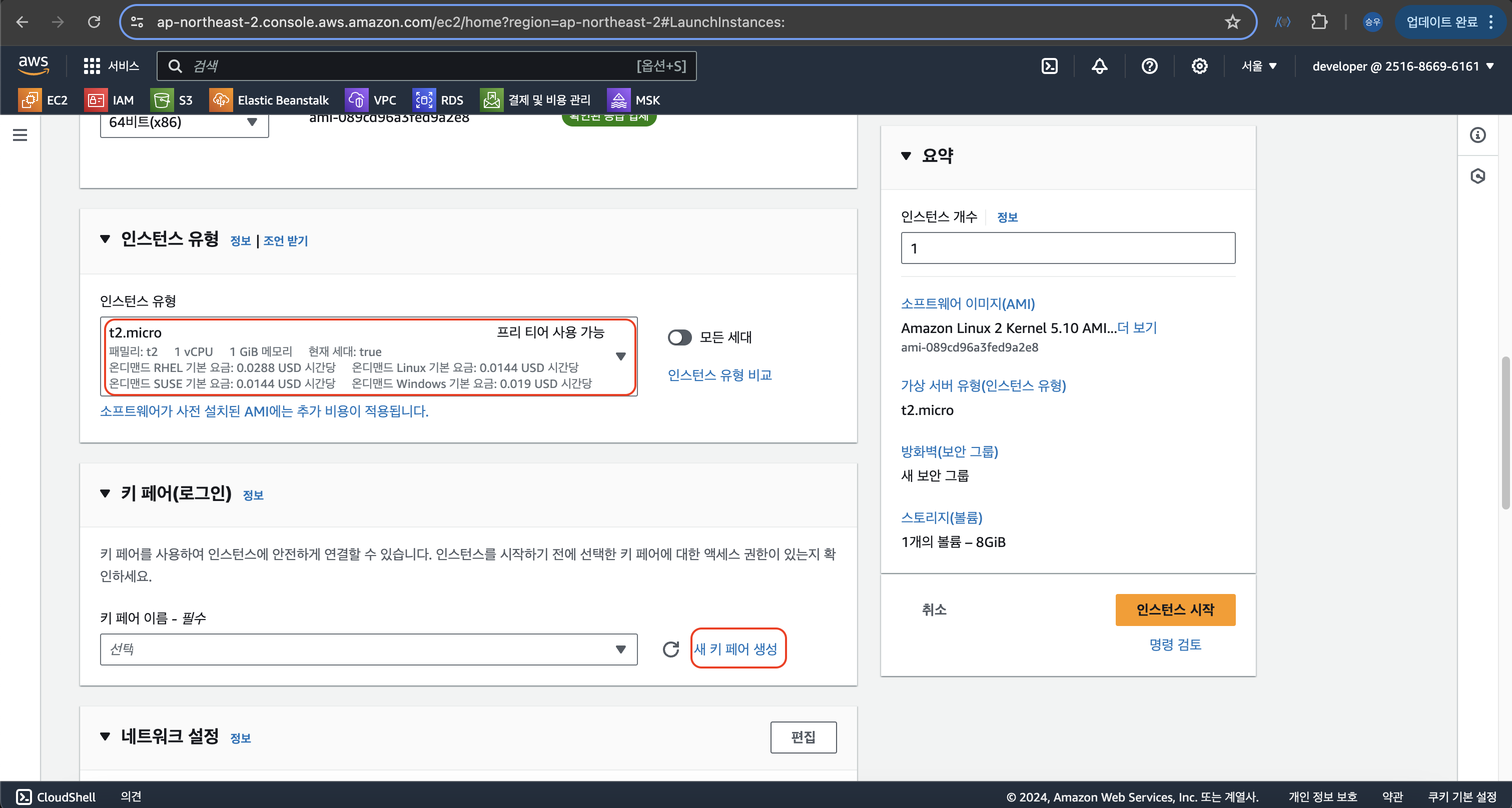 키페어 : 새 키 페어 생성 후 저장(이름 : developer)
