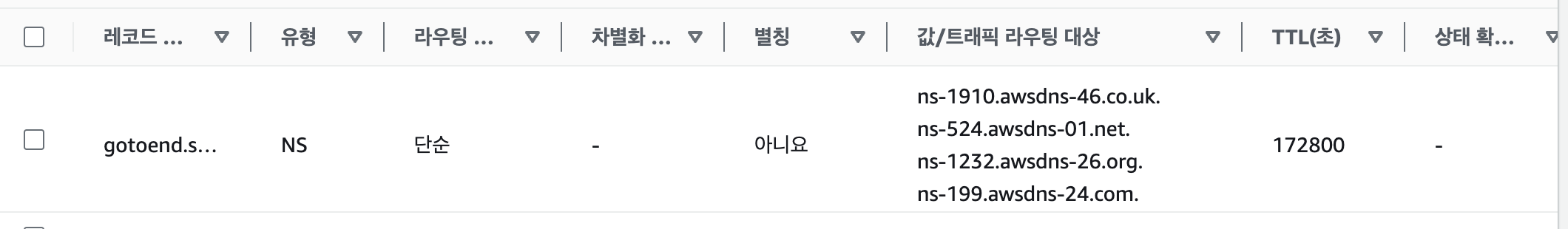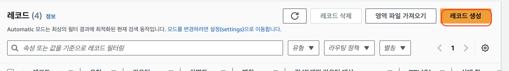 - NS(Name Server) : 도메인 네임서버의 이름을 나열. Route 53 만들면 기본 4개의 DNS서버가 레코드 정보를 관리 - 자동생성