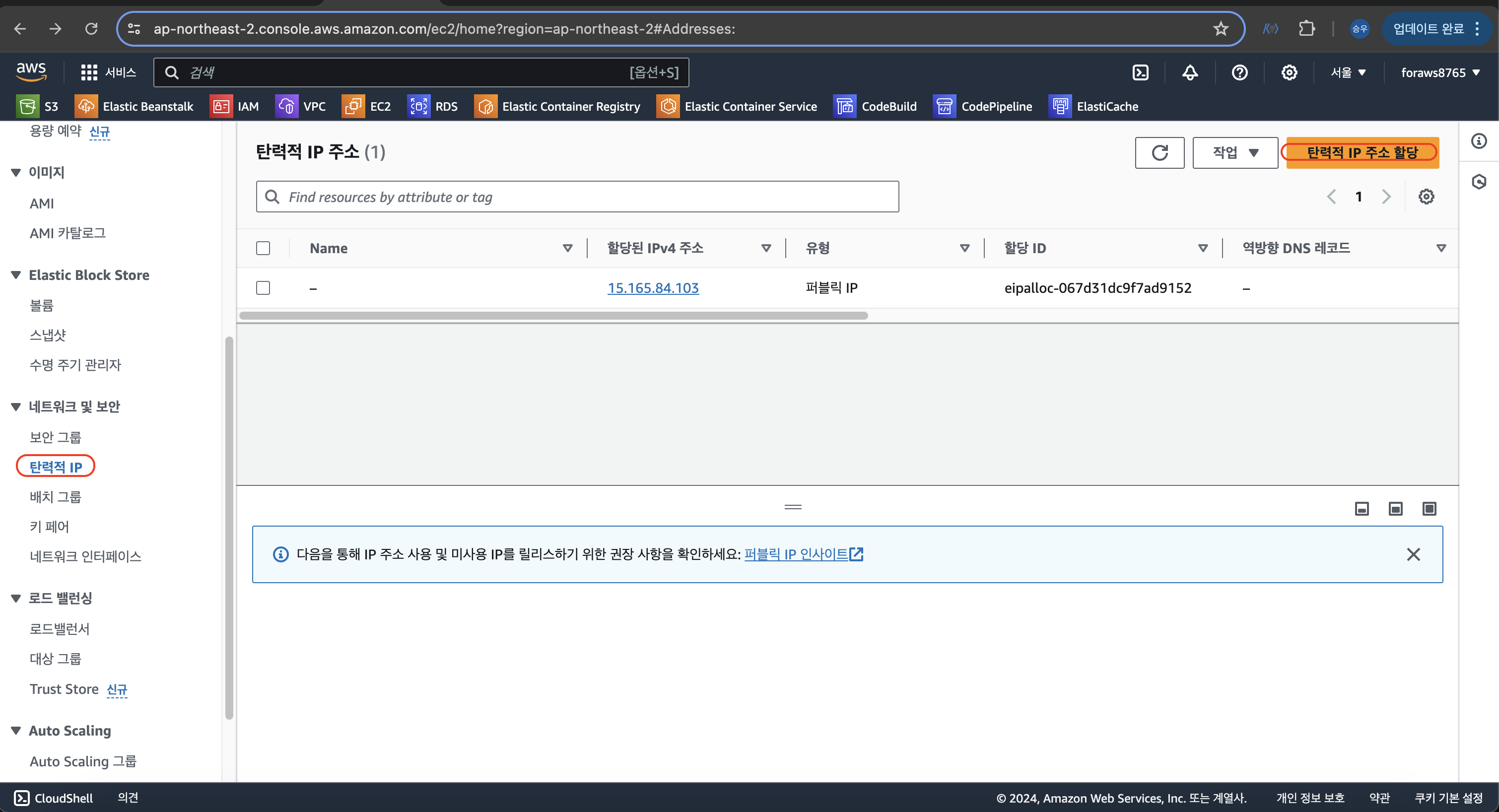 > EC2 -> 탄력적 IP -> 탄력적 IP주소 할당 클릭