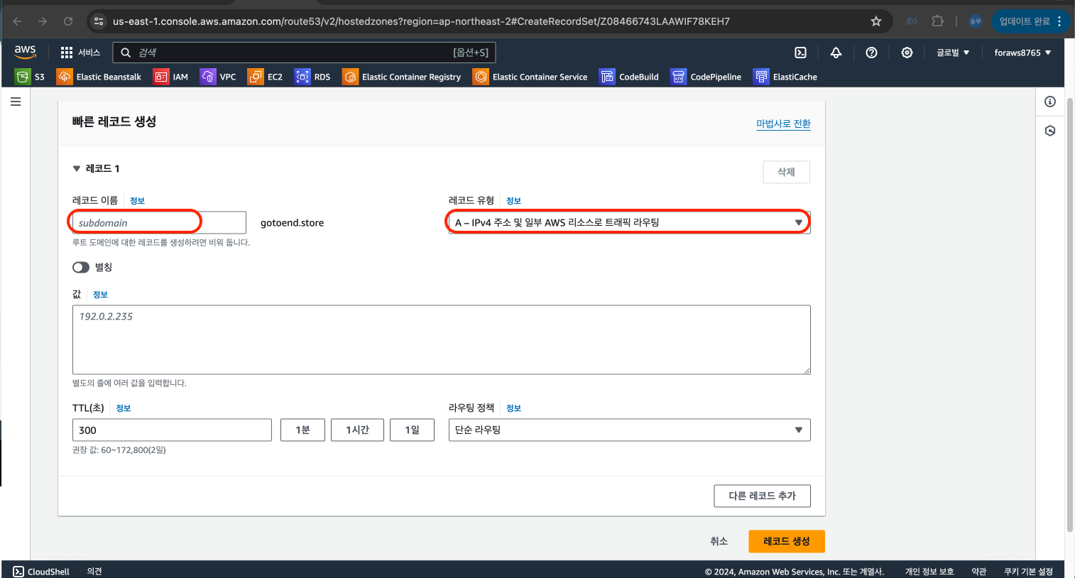 - A(Address) : 특정 FQDN의 IP 주소 나열 - 따로 설정(IP가 자주 변동되면 안되기 때문에 EC2에 탄력적 IP 설정)