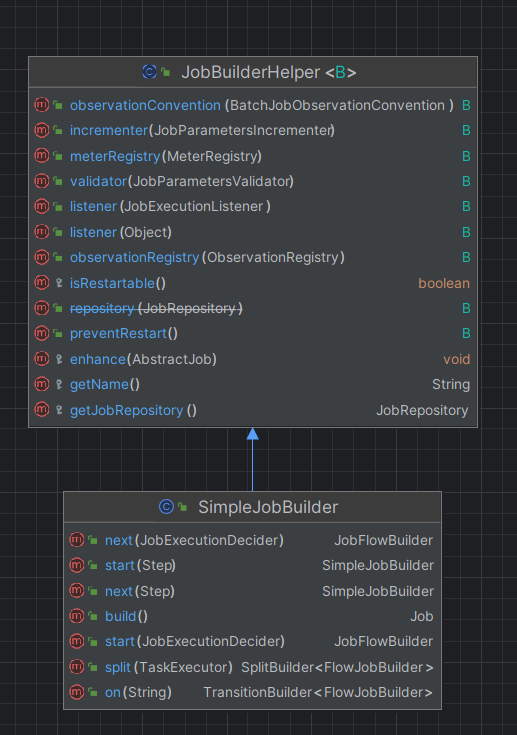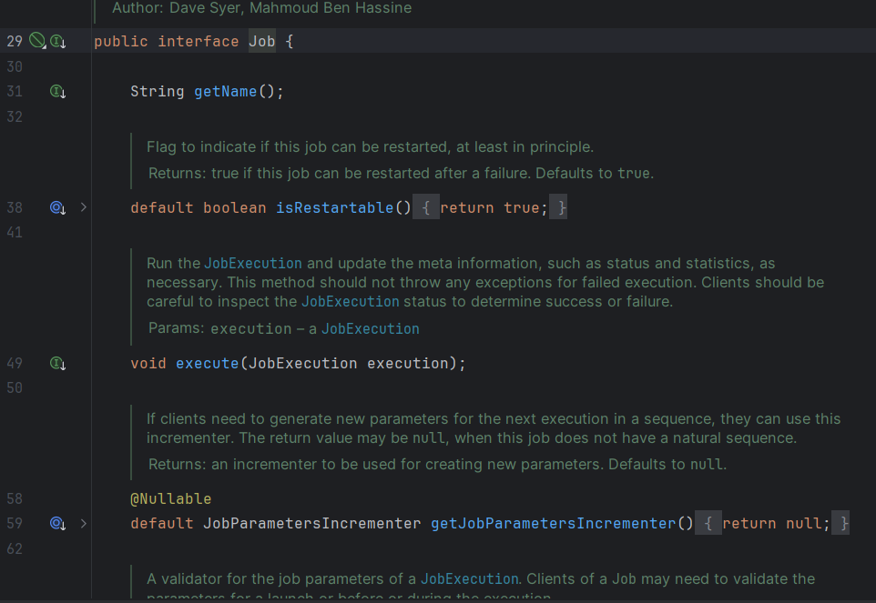 JobRepository와 Step들을 DI받고 있고, restart를 방지하고, listener를 추가하고, Validater, Incrementer까지 다루는 것을 볼 수 있다. 이제 전체적인 Job에 대한 이야기는 어느정도 한 것같다. 이제부턴 세부적인 부분을 짚어보고자 한다.