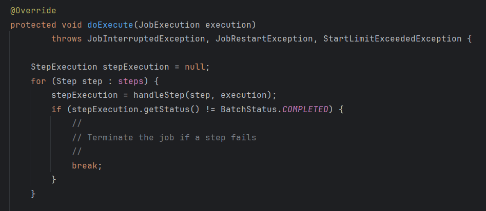 우선 기본적으로 Job은 Job의 이름, Step의 정의 및 순서, 작업을 다시 시작할 수 있는지 여부로 구성되어있다.