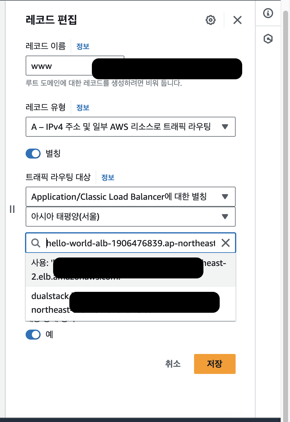 - 만든 도메인으로 접속하면 바로 EC2로 접속하는게 아닌, 로드 밸런서로 접근하게 해줘야한다. Route53에서 설정해주자.
