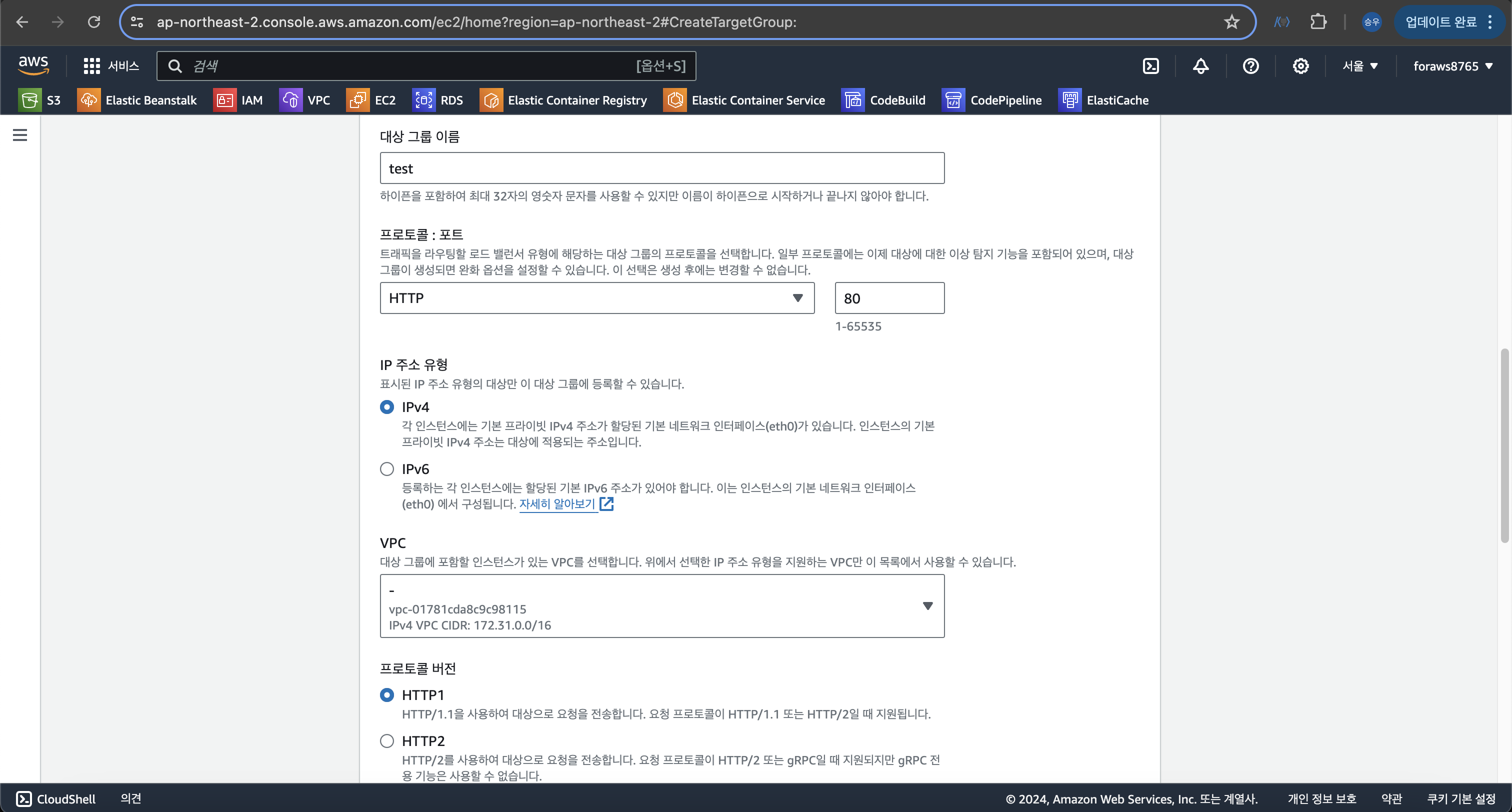 > 프로토콜 = HTTP, 포트 = 80 -> EC2 인스턴스가 80포트 이용하기 때문