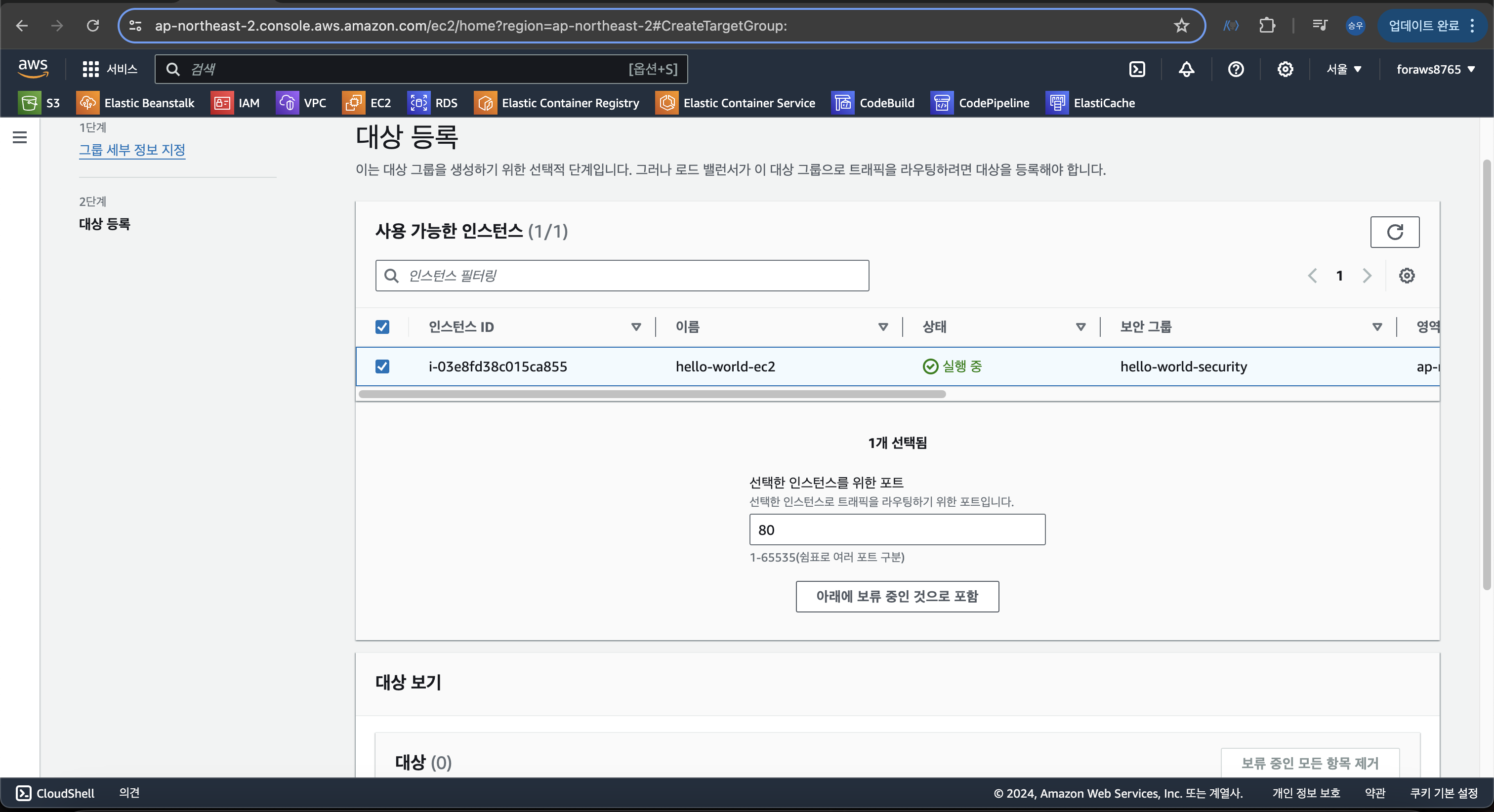 위에서 하다 만 로드 밸런서 생성과정중 생성한 대상 그룹을 설정해주자.