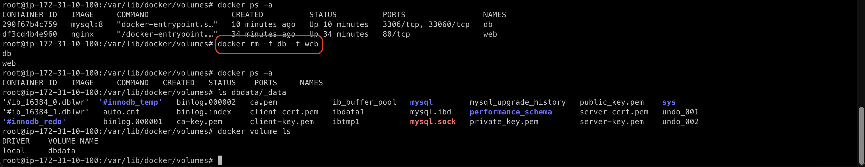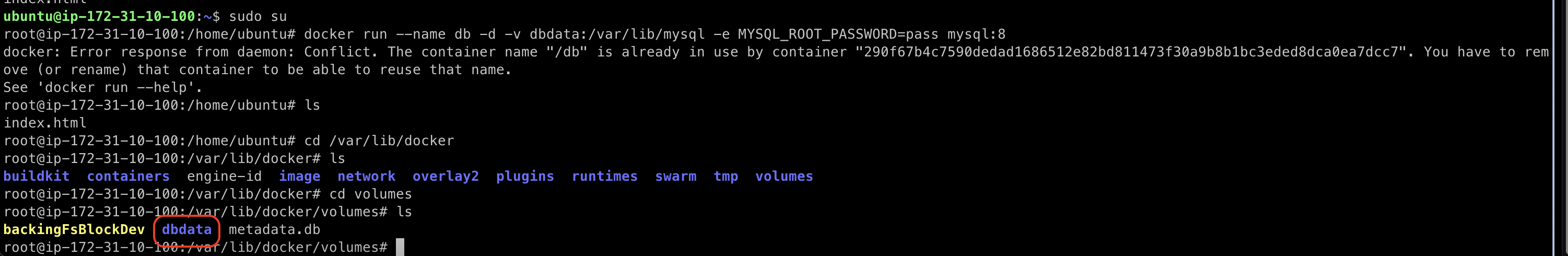 docker run --name db -d -v dbdata:/var/lib/mysql -e MYSQL_ROOT_PASSWORD=pass mysql:8