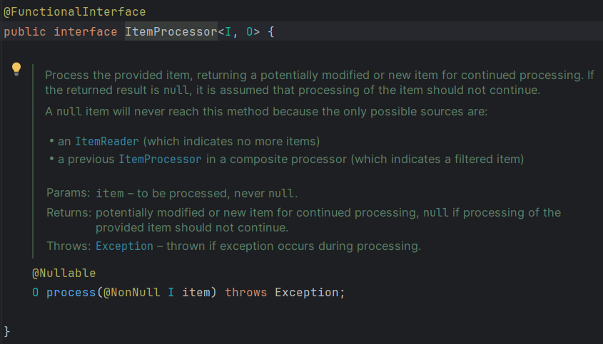 이에 따라 Processor는 Writer, Reader와 비교했을때, 오버라이딩해서 상황에 맞게끔 직접 로직을 짜는 특징이있다.