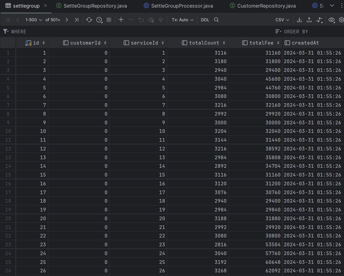 Reader에서 읽어온 Customer 정보를 인자로 넘겨받아서 그 고객의 아이디, 해당되는 서비스아이디, 횟수, 총금액을 반환하도록 쿼리를 써줬다. 이미 일일 정산 배치에서 구현해서 테이블에 데이터들이 남아있는 SettleDetail에서 해당되는 고객의 정보를 뽑아온다.