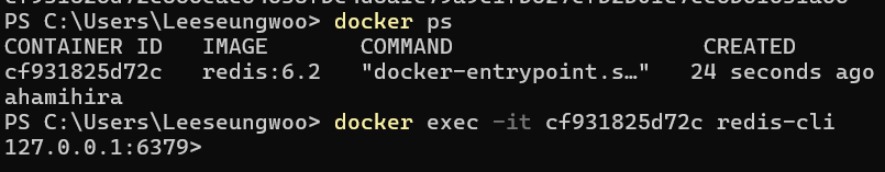 docker exec -it [컨테이너 아이디] redis-cli