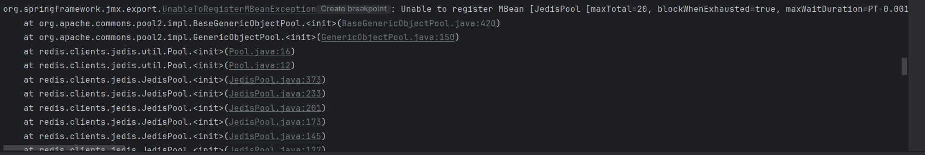@Bean 에 대해서 스프링 프레임워크가 어떻게 동작하는지 알면 문제를 알 수 있는데, 스프링 빈으로 등록된 모든 객체를 시작과 동시에 MBean으로 등록한다. 근데 위 Config 파일은 JedisPool connection 수립후 return으로 다시 JedisPool을 Bean으로 등록하고자 해서 중복으로 Bean을 등록하려고 해서 발생한 예외이다.