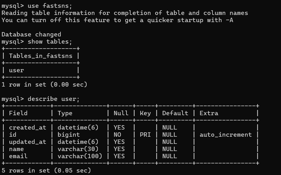 실행 시킨 후에 CLI로 확인 해보면 테이블이 생성된걸 확인할 수있다.