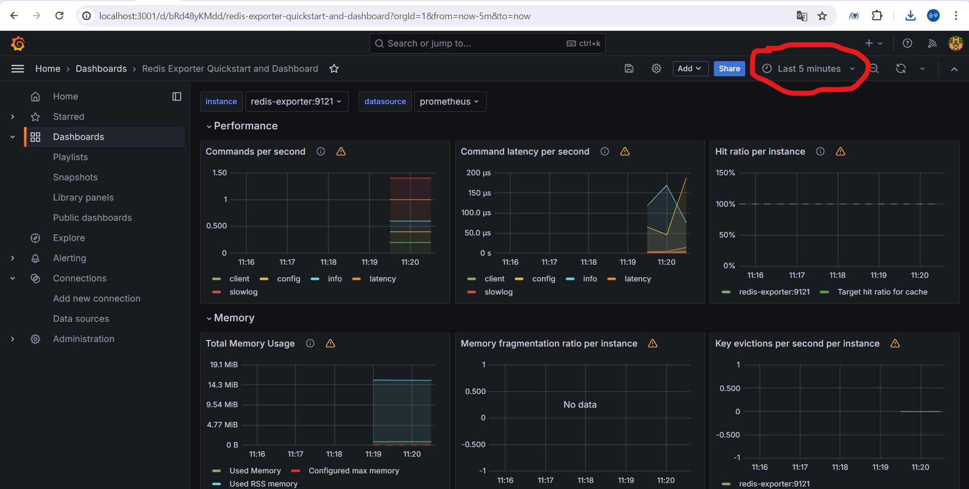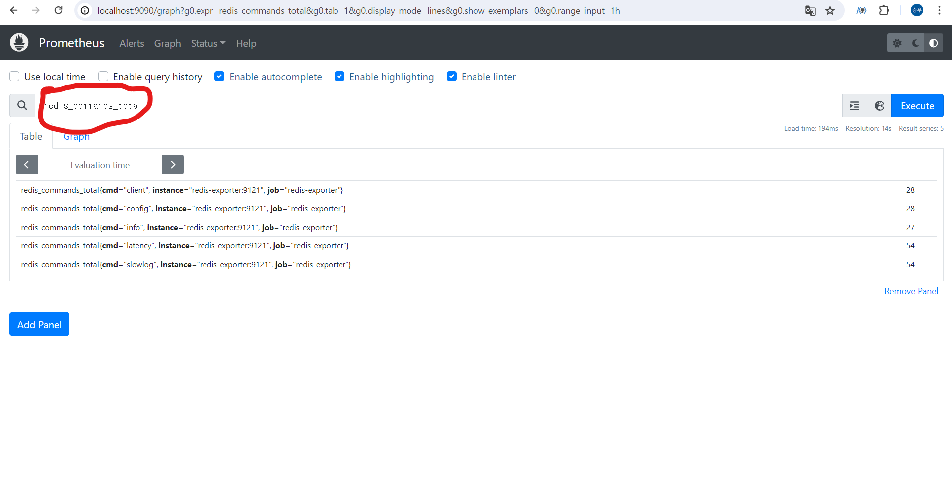 프로메테우스가 Redis-exporter 한테 5초주기로 요청해서 가져온 값을 적재된것을 확인할수 있다.