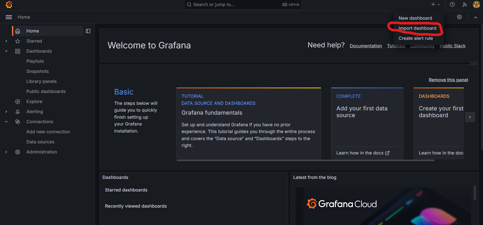 그 이후 grafana에 들어가서 우측상단 + 를 누르고 import dashboard를 누른다음 json파일을 복사 혹은 첨부해준 다음 import를 눌러준다.