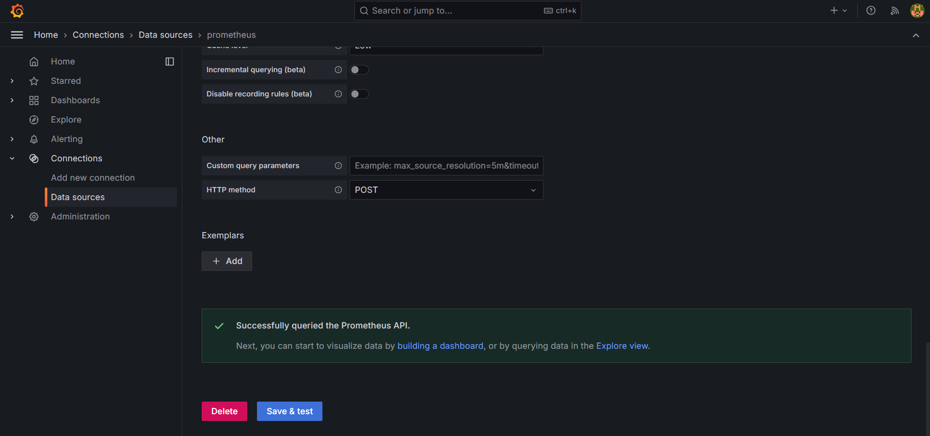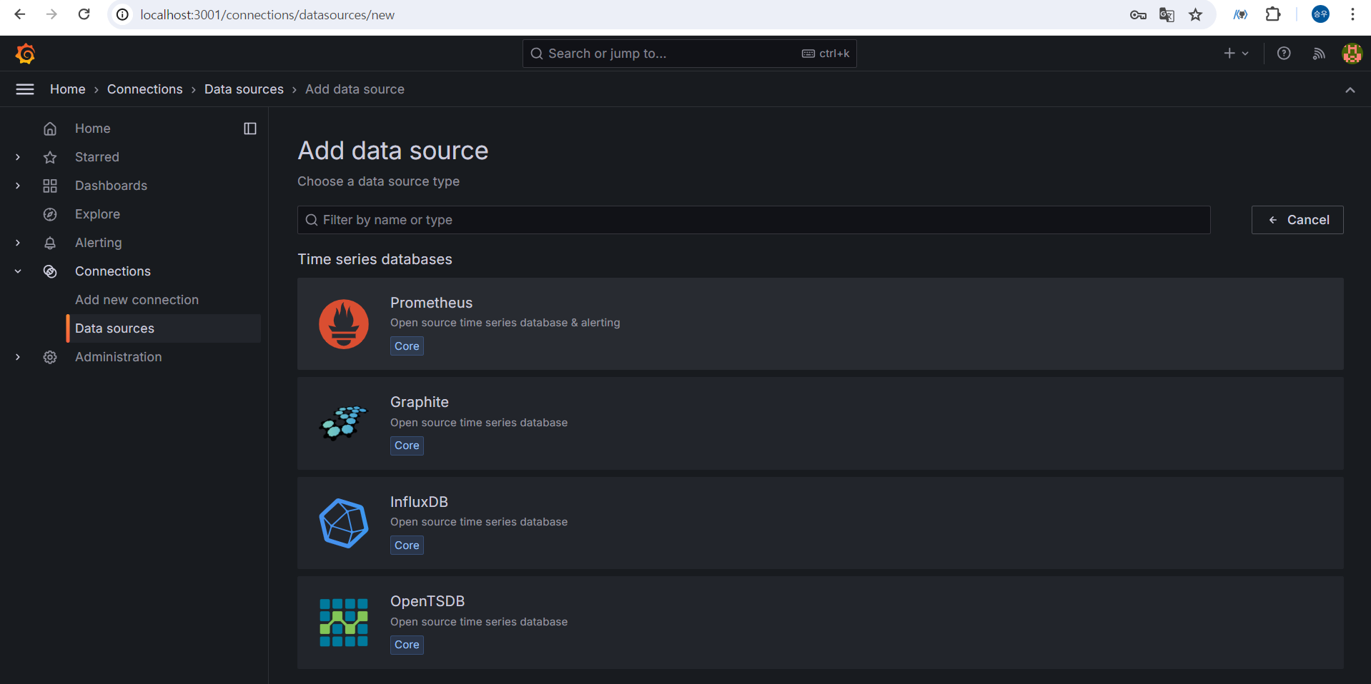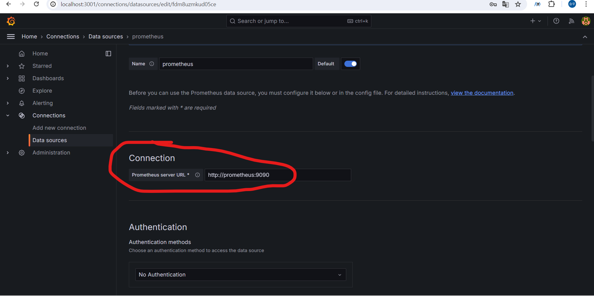 나의 입장에서는 localhost:9090이 맞지만 지금 여기서 설정하는 것은 grafana입장에서의 prometheus주소이다.