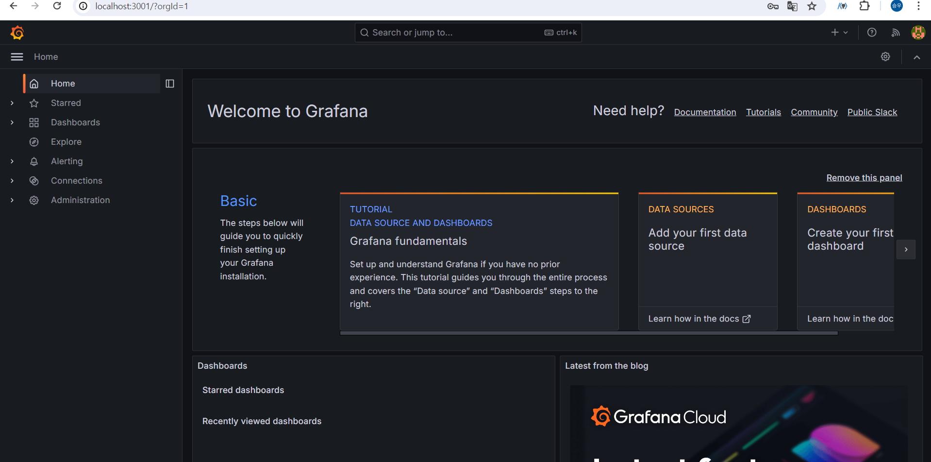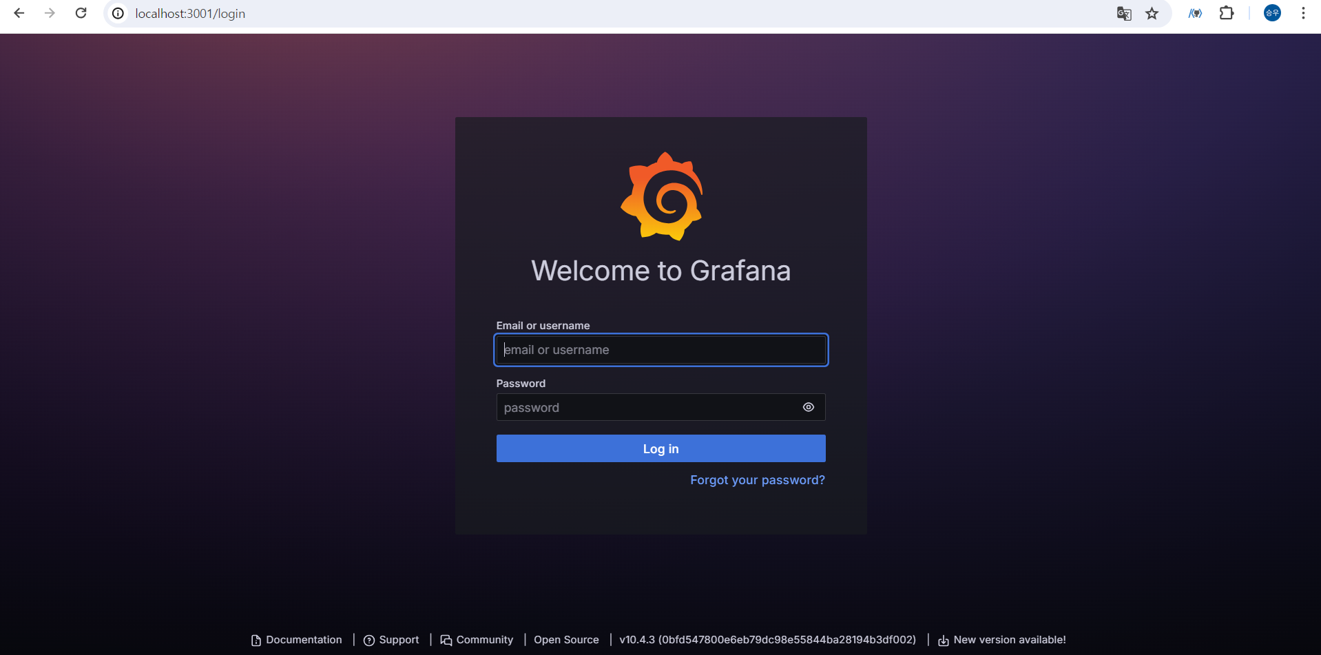 설정한 3001번 포트로 접속하면 Grafana로그인화면이 나온다.