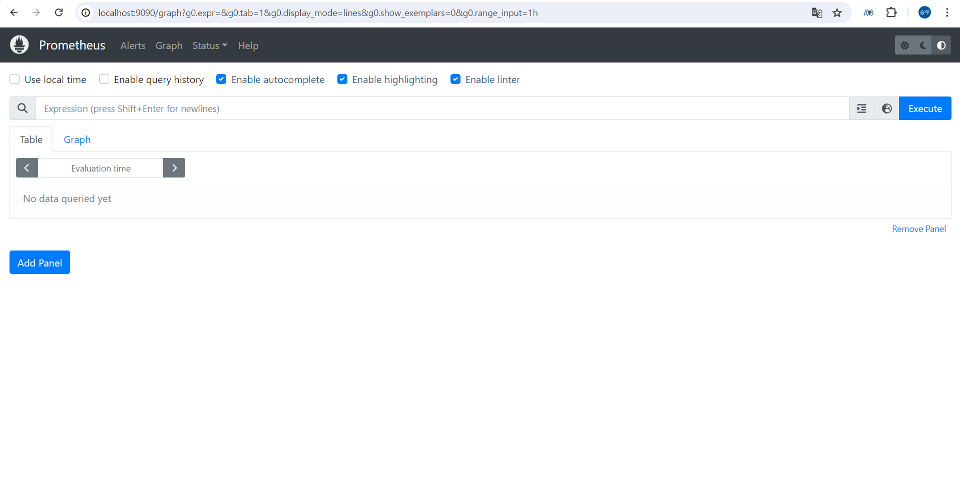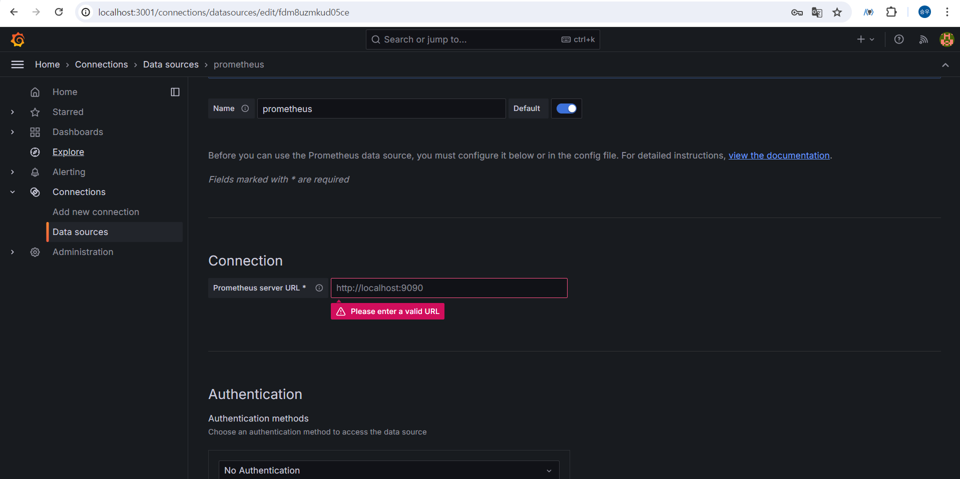 프로메테우스의 URL을 기입하는란이 나온다. 여기서 localhost:9090 이라고 하면 안된다!!
